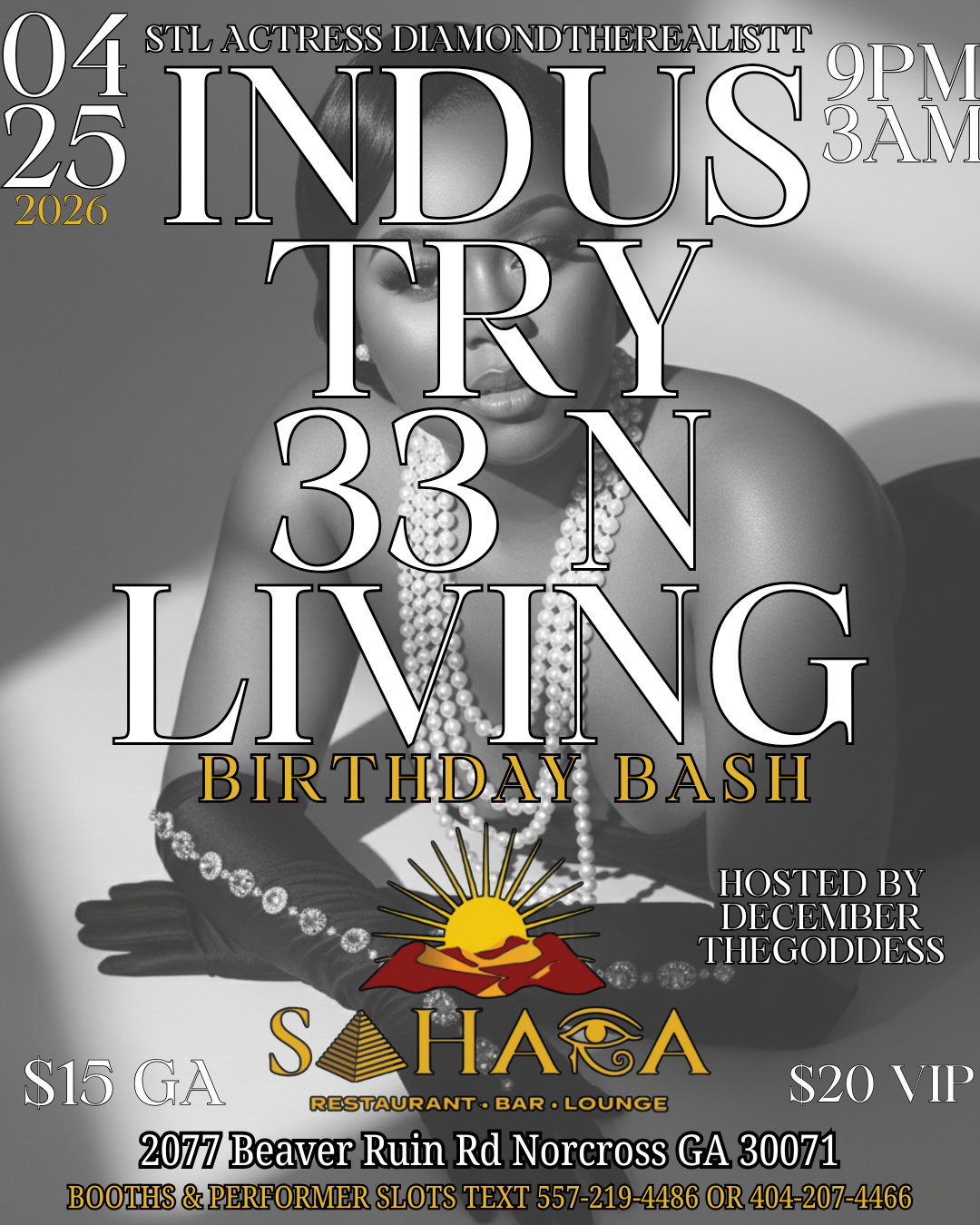 Industry 33'n Living Birthday bash in Norcross GA will be in the building Hosted by December the Goddess calling all Actresses/ Actors , Public Figures and Industry stars and supporters come and support me